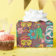 Niedliches retro tiki inspirierte Geschenkverpackung. Tiki Masken und niedliche hula Mädchen in einer modernen kitschy Art der Mitte des Jahrhunderts, in Braunem, in korallenrotem, gree und aquamarines.
