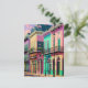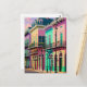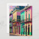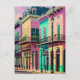 Eine lebhafte und farbenfrohe Illustration einer bezaubernden Straße in New Orleans, Louisiana, mit Reihen von bunten kreolischen Stadthäusern. Die Gebäude sind in kräftigen Rosa-, Gelb-, Grün- und Blautönen gestrichen, die Balkone sind aus Schmiedeeisen und verzierte Details. Die Straße ist von Laternenpfählen gesäumt und belebt, und die Leute gehen entlang der Fußgängerpromenade und genießen die lebendige Atmosphäre.