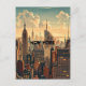 Eine lebendige und farbenfrohe Illustration der New Yorker Skyline bei Sonnenuntergang, die in einem Retro-Vintagen Stil dargestellt wird. Das imposante Empire State Gebäude ist in der Mitte hoch und strahlt goldenes Licht aus. Der Himmel strahlt in Orange, Rosa und lila Farbtönen aus und spiegelt sich in den ruhigen Gewässern unten wider. Ein Segelboot und ein Motorboot gleiten friedlich über den Fluss, was der Szene eine Touch der Ruhe verleiht.