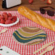 Retro Waves Abstraktes Muster Rost rot Senf Blau. Coole Vintag psychedelische Trippy-Boho-Ästhetik. 60er 70er zeitgenössisches, modernes Ambiente. In warmen Erdtönen. Von Kierkegaard Design Studio.