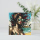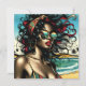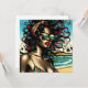 Hübsche Retro-Amerikanerin in Bikini, die am Strand sitzt und eine Sonnenbrille in Vintagen Farben im Stil eines Pop Art Comic trägt.