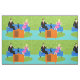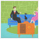 Ce rétro ajouter au tissu de chat comporte un couple de bande dessinée essayant de devenir confortable tout en regardant la télévision une moitié du siècle moderne, sofa bleu. Le chat, cependant, a d'autres idées. D'un côté du sofa, il y a un homme bel dans un costume noir avec la cravate rouge. De l'autre côté du divan élégant, il y a une belle, blonde femme dans un montage de forme, rose indien s'habillent. Les choses iraient grandes si elle n'étaient pas pour le chat noir lisse, qui a étendu la réclamation au coussin central de sofa. Ce style des années 1960, conception minimaliste d'art est placé dans un salon élégant. Le contexte du sofa est un vert, mur en pierre. Sur le plancher d'aqua, il y a une couverture de tapis à longs poils ronde et verte, qui assortit le mur en pierre. Au premier rang de la conception, nous voyons le dos d'un téléviseur orange avec des oreilles de lapin, qui semble jouer le programme préféré de la TV du chat.