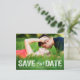 Postkartenankündigung Ihres Hochzeitdatums. Benutzen Sie Ihr vollflächiges Bild mit "Rett unser Datum" über Ihrem Foto. Optionaler schwarzer Farbverlauf für den unteren Rand der Karte, um den Typ zu unterscheiden. Klicken Sie einfach auf das Augensymbol, um es erscheinen zu lassen und bewegen Sie sich nach oben oder unten, je nachdem, wie viel Farbverlauf Sie gewollt haben. Passen Sie Ihre Namen und das Datum auf Vorder- und Rückseite an. Es ist eine weitere Karte mit einem weißen Farbverlauf mit dunklem Typ verfügbar.