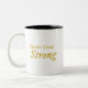 Die "Rhode Island Strong" Zwei-Tone-Kaffee-Tasse verkörpert zeitgenössische Design-Trends und feiert gleichzeitig die Widerstandsfähigkeit und den Geist von Rhode Island. Diese Tasse, die mit einem scharfen Blick für moderne Ästhetik gestaltet wurde, verbindet die minimalistische Eleganz nahtlos mit einer wirkungsvollen Botschaft. An der Vorderseite der Tasse wird die fett-stylische Typografie gezeigt, die "Rhode Island Strong" in goldenen Buchstaben ausdrückt. Der Einsatz von Goldakzenten verleiht der Tasse eine Touch von Luxus und Prestige, was die visuelle Anziehungskraft erhöht und eine kraftvolle Aussage macht. Die Wahl des Schriftartes spiegelt moderne Designsensibilitäten wider, mit schlanken Sans-Serif-Figuren, die ein Gefühl von Stärke und Widerstandskraft vermitteln.