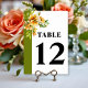 Rhododendron branch with orange yellow flowers wedding table number card. Elevate your wedding reception with this beautifully designed table number card, featuring a delicate watercolor rhododendron branch adorned with orange yellow blossoms and green leaves. Positioned in the upper left corner, the botanical illustration creates a romantic, eye-catching focal point. An olive hreen border along the left side adds a refined touch of elegance, while bold, stylish typography ensures excellent readability.