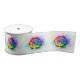 Große, blühende Rose mit Regenbogenblüten auf weißem Hintergrund, überstrichen mit farbenfrohen, hellen Farbtupfern. 3d