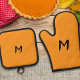 Ein minimalistischer und stilvoller Pothalter und Ofen-Mitt-Set, in einer festlichen Kürbisgelbfarbe. Personalisieren Sie Ihre Initial als Monogramm.