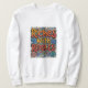 Ein lebendiges Design mit der Phrase "Riches with Riddles" in einem spielerischen, abgerundeten Schriftart. Der Text ist umgeben von einer farbenfrohen Reihe abstrakter geometrischer Formen und Symbole, die in einem symmetrischen Muster angeordnet sind. Das Gesamtbild ist fett und auffallend.