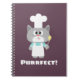 Niedlicher Koch mit dem Wort "Perfect!" über einer Aubergine lila Hintergrundfarbe.