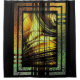 style art déco design en or miel, vert, brun doré et noir. un rectangle au centre avec des lignes fluides et une texture lisse, entouré de lignes art déco dans des directions horizontales et verticales sur une texture marbrée avec du vert se mélangeant graduellement au miel puis au brun doré. bel art numérique de style art déco en vert et or.