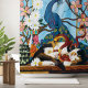 Calico cat jouant avec un dragon chinois rouge devant un vitrail de paon.