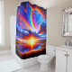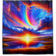 Ce rideau de douche a un coucher de soleil coloré représenté dessus.