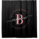 Fille, moderne, élégant, minimaliste noir et rose monogramme nom initial script personnalisé monogrammed rideau de douche. Doté d'une initiale monogramme et d'un script de signature de nom de poutre dans une police de calligraphie à la main avec des queues de swash et un cadre en cercle pointillé autour de votre monogramme. Un cadeau féminin parfait pour toute personne qui aime un style simple et assez élégant.