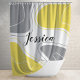 rideau de douche personnalisé avec un abstrait moderne géométrique formes motif dans la nouvelle couleur tendance gris et jaune et un imprimé de nom personnalisé au centre.