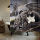 Le chaton tuxedo noir et blanc est assis à côté d'une gargouille. Derrière eux se trouve un château et des dragons.