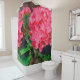 La photo originale de MaeFlowers sur ce rideau de douche est un closeup d'hydrangées roses et de leurs feuilles bordés de vert printanier. Le pompon central des pétales de fleurs remplit presque la photo, entouré par les feuilles verts et des morceaux d'autres pompons de fleurs de chaque côté.
