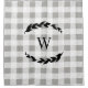 Lauriers et lettre feuillus noirs croquants de monogramme au-dessus d'un plaid blanc chic de ferme rustique et d'une conception grise !