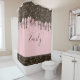Parties scintillant rose vif Fille Étincelle Nom personnalisé Rideau de douche. Panneau rose vif avec parties scintillant simulée rose, blanc et brun gouttes au sommet avec large bordure solide au fond. Nom monogrammé customisé dans le chocolat moderne en lettres manuscrites typographie de script. Grand cadeau pour votre fille glamour branchée. Ne manquez pas d'ajouter la ligne de douche à votre panier ! Step by Step Inspiration Series disponible exclusivement sur Zazzle à l'adresse zazzle.com/store/KrisHarty, conçu par le designer international Kris Harty. © 2022 Kris Harty Pas à pas Conception inspirationnelle