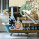 Green dragon in a tea cup that is on a pile of books. Top a, elixirs, a feather pen with inkwell and a clock with gears showing are all around the dragon.