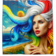 Ce rideau de douche a une dame arc-en-ciel dessus.