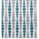 Ce rideau de douche a un design moderne du milieu du siècle de rectangles turquoises et gris arrondi de taille croissante et décroissante courant verticalement sur un champ de blanc.