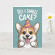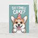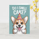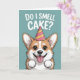 Eine niedliche und lustige Geburtstagskarte mit einem bezaubernden Cartoon-Corgi mit einem Party-Hut und einem Lächeln mit Aufregung unter dem Satz "Rieche ich Kuchen?". Ideal für Hundeliebhaber, Freunde und alle, die einen spielerischen Spaß genießen.