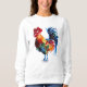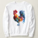 Traditionelles Aquarellkunstwerk eines großen Hähnchens oder eines männlichen Huhns mit vielen bunten Federn auf seinen Flügeln und Schwanz auf einem Sweatshirt.