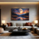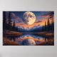 Ein Riesenmond dominiert den Nachthimmel, beleuchtet schneebedeckte Berge und reflektiert auf einem ruhigen See. Große Bäume umrahmen die Ufer, orange und blaue Wolken malen den Horizont. Sterne blinken herum und schaffen eine magische Szene, die Frieden und Staunen vermittelt. Dieses Kunstwerk vereint himmlische Schönheit und irdische Stille in einem Single. Es ist perfekt, um Träume und Verbindungen mit der Natur zu wecken.