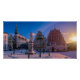 Sonnenuntergang überdacht im Schnee Riga Riga Rathausplatz im Winter in Riga, Lettland. Aussicht auf das berühmte Haus der Blackheads und die Statue von Roland gegen den blauen Himmel mit Sonnenuntergang