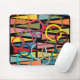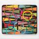 Dieses Mauspad hat ein modernes Design aus Dreiecken und Ringen in Retrofarben auf einem schwarzen Feld.