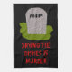 Dieses phantastische Küchentuch hat einen grauen Grabstein mit RIP in tropfschwarzem Text, stehend auf einem grünen Gras. Der Hintergrund ist schwarz, passend zu diesem morbiden Design. Es gibt einen lustigen, individuell anpassbaren Text mit dem Titel "Das Trocknen der Geschirr ist Mord"