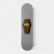 This awesome skateboard feys a creepy coffin made from wood with gold edging. The coffin lid is slightly open revealing only darkness within. The gold platte on the front of the coffin has spooky black text on it that says RIP, giving no clue who or what might be lurking inside. This fun yet sinister coffin is ideal for Halloween. The bleak grey background acts to draw the eye of the observer towards the coffin of doom.