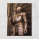 Ein Foto eines Ritters in einem Anzug der Rüstung aus der mittelalterlichen Zeit. Er ist stehender Wächter vor einer alten Schlosstür.