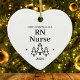 Erste Weihnachten als RN oder registrierte Krankenschwester Herz-Ornament für einen neuen Job in der Pflege. Elegante Porzellan Keramik Urlaubsornamente in Weiß mit schwarzer Schrift. Mit Weihnachtsbäumen und Sternen.