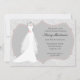 Une invitation nuptiale élégante de douche avec la belle robe de mariage avec des accents de fleur de pêche sur le cintre avec l'arrière - plan gris et la frontière florale. Les invitations viennent complet avec des enveloppes et votre choix de papier.