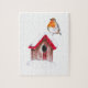 Handgezeichnete Illustration eines niedlichen Winterrobins, der bei Schneewetter auf seinem Haus sitzt.