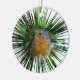 Ein digital erweitertes Foto eines Rotkehlchens, das auf einem runden Weihnachtsbaumschmuck gedruckt wurde.