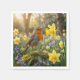 In a sunlit garden, a robin sings atop a moss-covered rock into a yellow daffodil, surrounded by blooming bluebells and daffodils in springtime