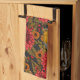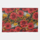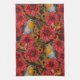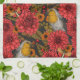 Robinen im Herbstgarten, rote Dahlien auf schwarz Geschirrtuch