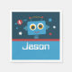Niedliche personalisierte glückliche 1. Geburtstagszeitung Servietten mit farbenfrohen Roboter umgeben von Sternen, mit Riesenaugen und Antennen auf seinem Kopf. Ein Planet hat eine Zahl 1 und einen anpassbaren Namen. PinkInkArt Original!