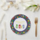 Roboter-Geburtstags-Party Papier-Teller personalisiert in Rotem, in Gelbem, Blau und Rot. Kreidehintergrund und bunte Partyflagge