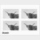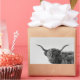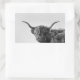 Rechteckiger Aufkleber mit einer robusten, aber lustigen schottischen Higland-Kuh mit großen Hörnern, langen Haaren vor den Augen und der Mund halb offen in schwarz-weiß / monochrom.