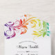 Rainbow Farben farbenfrohe Blätter und schwule und lesbische Hochzeitseinladung, mit einem bunten Blätter in Regenbogenfarben auf weißem Hintergrund. Die Namen sind in der Skripttypografie und die RSVP-Karte kann getrennt werden.