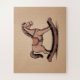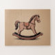 Ein Rätsel mit Farbverlauf und konturiertem beigen Hintergrund und eine Abbildung eines handgefertigten Rockpferdes in Brauntönen: ein nettes Geschenk für ein Kind oder einen Liebhaber von Holzspielzeug!