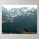 Ein junger Elch betrachtet die Landschaft mit schneebedeckten Felsspitzen im Hintergrund.