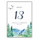 Diese Rocky Mountain Hochzeit in Urlaubsort Tischnummer ist ideal für eine Hochzeit im Freien. Das Design zeichnet sich durch eine blau-grün gestrichene Wildnislandschaft mit Aquarellkiefern, Vögeln und Bergen aus. Die Karte druckt auf der Vorder- und Rückseite (beidseitig). Fügen Sie jede Tischnummer, die Sie benötigen, einzeln in Ihren Warenkorb.