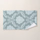 A vintage style decorative damask surface pattern influenced by rococo classical design in duck egg blue color detail on a teal background.