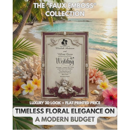 Set the tone for a fairytale garden ceremony with this ornate design featuring soft sage, dusty rose, and classic typography. Elegant, vintage, and romantic.This design features a digitally rendered composition mimicking the depth of 18th-century relief plasterwork. The layout centers on a cream background framed by intricate scrollwork and acanthus leaves in a shadowed beige tone. Within the border, a detailed illustration depicts two white swans forming a heart shape, flanked by whimsical cherubs playing harps. Clusters of dusty rose tulips and soft pink roses accent the corners. The typography hierarchy utilizes a burgundy handwritten script for names, grounded by a dark grey formal serif font for the event details.