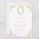 At the heart of the invitation lies a hand-painted monogram crest, inspired by the floral beauty of the Rococo era. The intricate design features a harmonious blend of blue, gold, soft pinks, and greenery. This crest serves as a stunning centerpiece, symbolizing the unity and love shared by the couple.