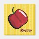 Ein roter Chili-Pfeffer ist mit den farbenfrohen Textilien Perus inspiriert und sitzt auf einem gelben Hintergrund mit einer kleineren Version des gleichen Musters und einem Schriftzeichen in der Ecke. Dieser würzige Pfeffer wird in Peru und Bolivien gegessen und wird seit der Zeit vor Incan in der Gegend gezüchtet.